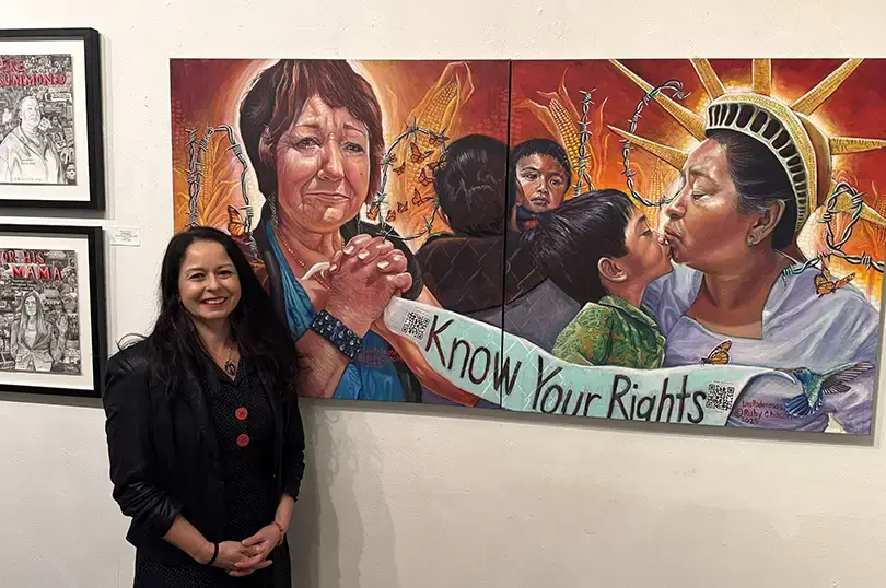 Местные художники из Sacramento Poderosas, Art of Resistance и нового коллектива The Community Collective представили яркую выставку, в которую вошли награждённые работы мигрантской тематики художницы Руби Чакон.
