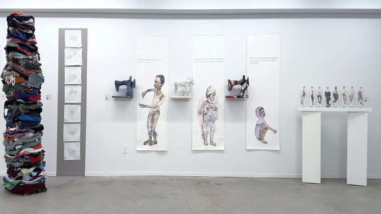 Её вторая работа включает в себя швейные машины, обёрнутые текстилем, в сопровождении портретов, что олицетворяет проблему детского труда в текстильной промышленности.